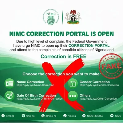 The misleading flyer, which has gained traction across social media platforms, features the logos of NIMC and the Federal Government, falsely claiming that a correction portal was opened following a “high level of complain.”